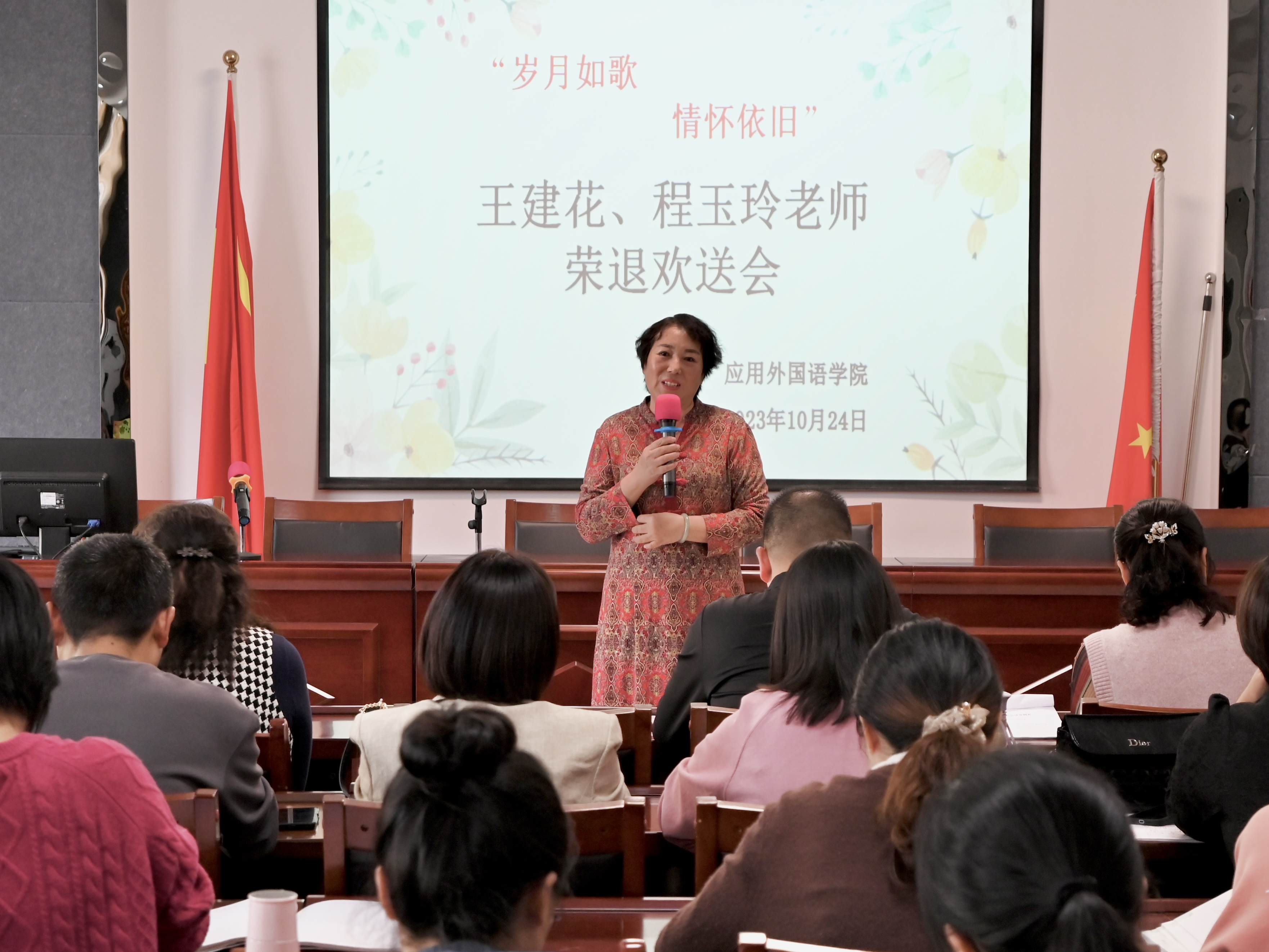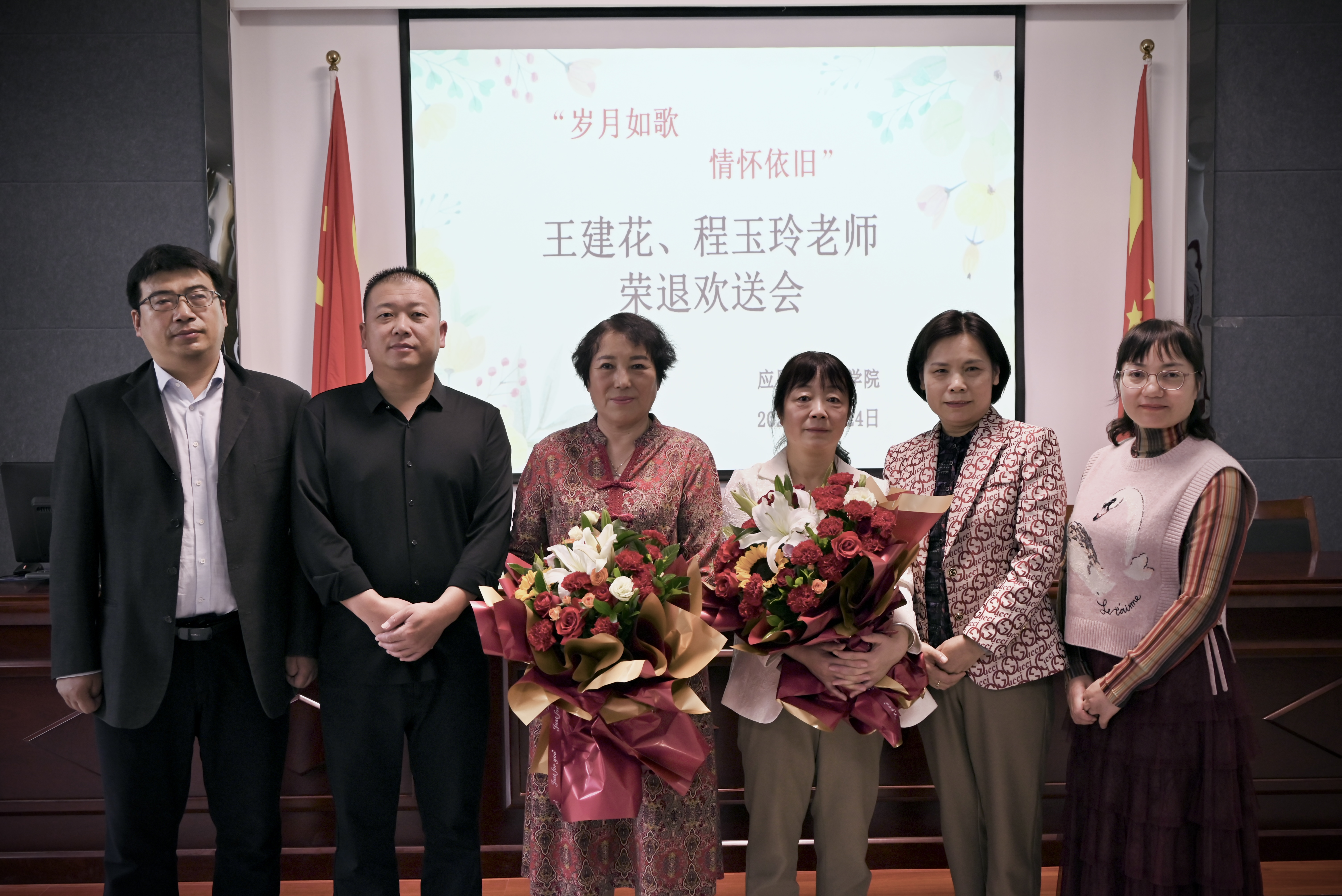 英才遍天下,岁月染芳华。在全场诚挚的祝福声中,王建花老师和程玉玲老师分别发表了退休感言,畅聊过往,追忆往昔的点点滴滴。王建花老师和程玉玲老师感谢学院领导对退休教师的关怀,分享了她们几十年从教之路的宝贵经验和生活阅历。同时也表示自己虽然退休了,但仍是学校的一员,还会继续为学校的发展尽绵薄之力,祝愿学校越来越好。beat365中文官方网站向两位退休教师送上了鲜花和退休礼物,表达对两位老师的无比敬意。