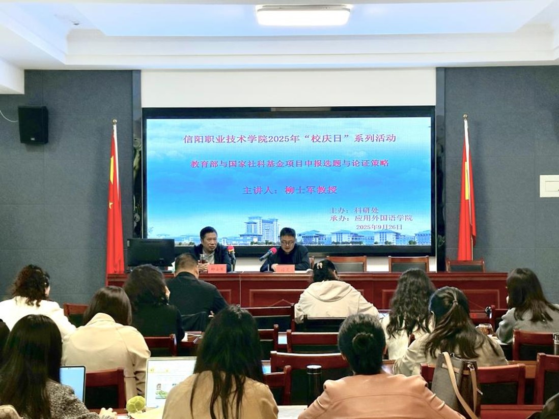 9月26日下午,信阳师范大学英语语言文学学科带头人柳士军教授应邀莅临我院做了一场题为“教育部与国家社科基金项目申报选题与论证策略”的专题报告。报告会由beat365中文官方网站书记徐昊主持,学院全体教师参加。