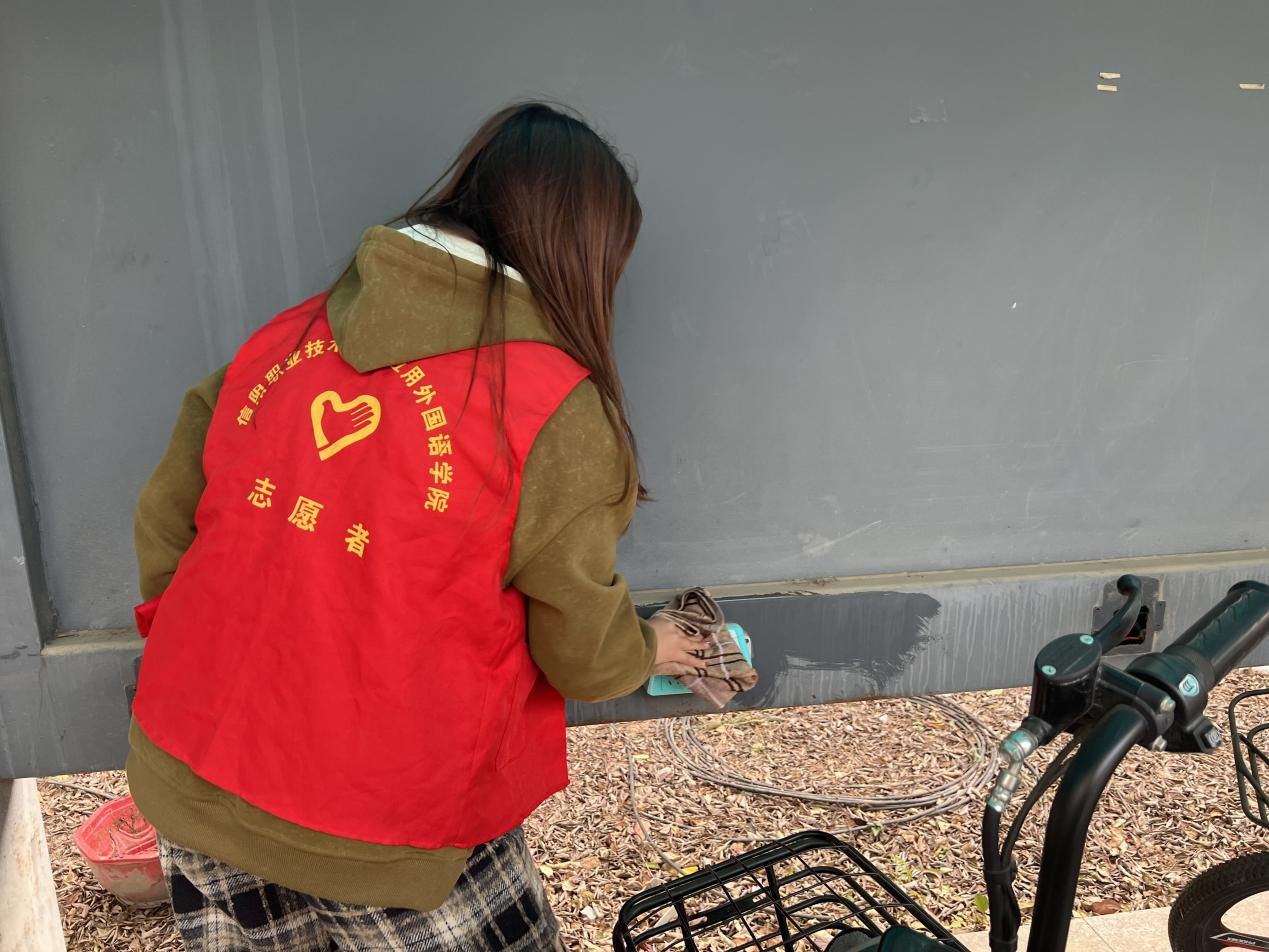 活动地点在学校龙飞苑小区,负责人分发志愿服并布置需要完成的任务后,同学们立即开始卫生清洁行动。同学们分组分工,擦洗各单元充电桩和标识牌灰尘、捡拾烟头、打扫地面卫生、清理水池内的落叶,相互配合共同完成任务,充分展现了我院学生不怕脏、不怕累、志愿服务我当先的奉献精神。