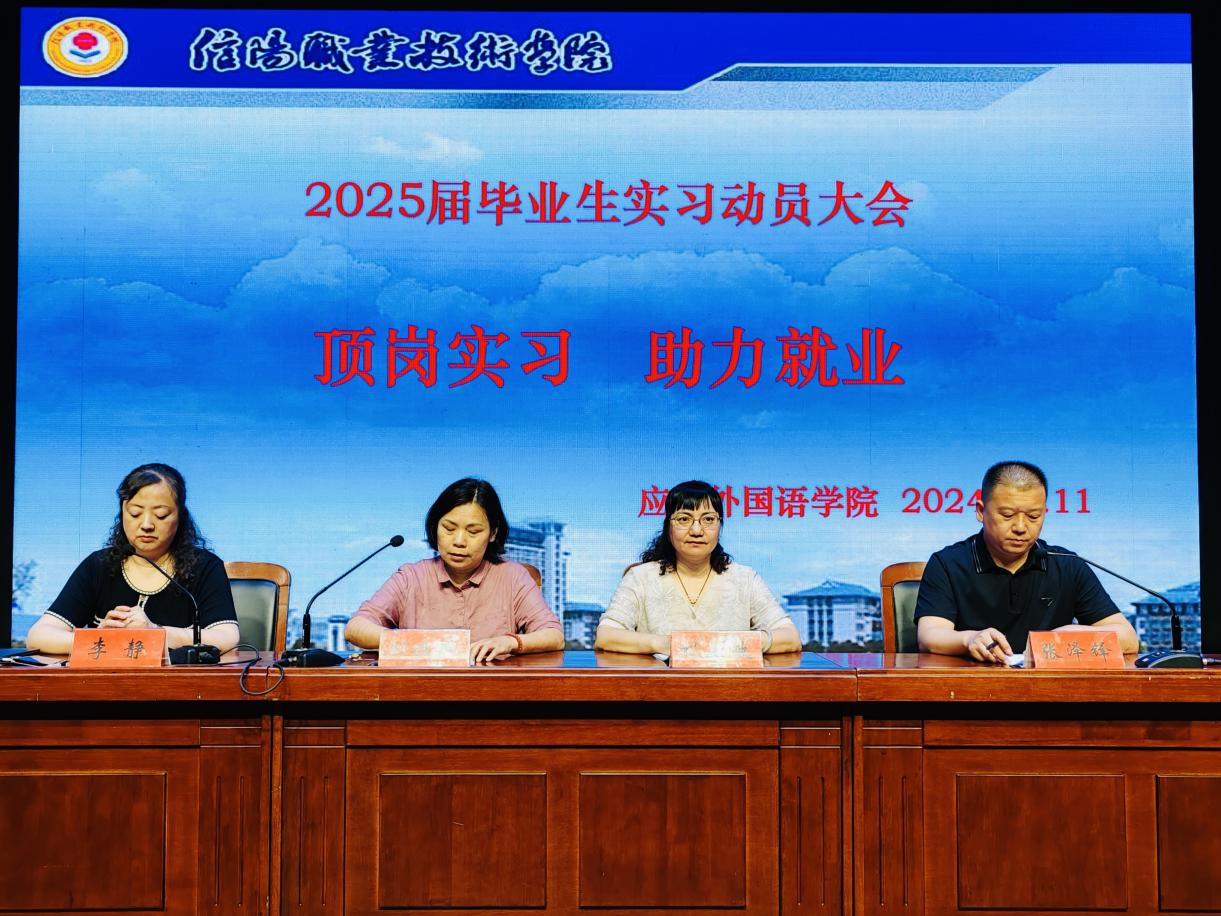 2024年6月11日下午三beat365中文官方网站在图书馆报告厅举行以“顶岗实习、助力就业”为主题的2025届毕业生实习动员大会。外语学院院长刘晓鹂、党总支副书记张泽锋、教学副院长刘文敏22级辅导员及全体毕业生参加了此次大会,会议由教务办公室主任李静主持。