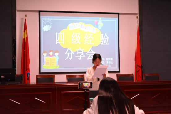 分享会正式开始,主持人用中英两种语言介绍本次嘉宾并指明活动的目的和意义。英语社指导老师严密以及几位英语四级考试高分获得者分别从听力、阅读、写作、翻译四大方面分享了备战四级的经验和考试技巧,为如何正确地备考四级指明方向。发言完毕后,现场进行了十五分钟的线下、线上提问环节,听众们争先恐后地提出问题,学生代表们认真解答疑惑。随后,指导老师严密上台对此次活动进行总结,再次指明重点备考技巧,并强调英语学习没有捷径,贵在日常积累和长期坚持,动员同学们从现在开始备考大学英语四级。