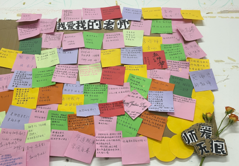这一天的外语学院处处充满爱的气息。有的班级同学们在上课前集体向任课教师表达爱意:“老师,您辛苦了!祝您节日快乐!”有的班级精心布置了班级心愿墙,同学们将自己想要对老师说的话写在便签纸上并贴在心愿墙上,由班长带领任课老师进行参观,满满一墙的感谢话也道不尽同学们对老师的敬爱。还有的班级为老师们准备了惊喜与满满的仪式感,为老师们献上一束美丽的鲜花和圆圆的月饼。