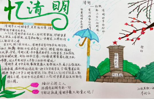 经过前期的精心准备,收到来自学院各年级共计100余副作品。在手抄报制作过程中,同学们用文字和图画介绍了清明节的由来和文化习俗、讲述了革命先辈的感人故事,表达了对先烈们的崇敬与缅怀之情。同学们兴趣浓厚,积极性很高,创作的手抄报作品图文并茂,富有时代性、知识性、趣味性和想象力,达到了较好的教育宣传效果。